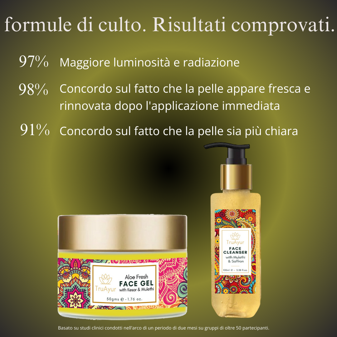 Radicato nei principi olistici dell'Ayurveda vecchi di 5.000 anni, questo duo è progettato per ripristinare l'armonia nella tua pelle. L'Ayurveda enfatizza l'equilibrio tra mente, corpo e spirito e questa filosofia è intrecciata in ogni ingrediente. Il Fresh Face Duo armonizza gli estratti vegetali più potenti della natura con una tecnologia avanzata per la cura della pelle, attingendo all'antica saggezza per nutrire e ringiovanire la pelle. Insieme, il detergente e il gel ripristinano l'idratazione, migliorano la lucidità della pelle e uniformano il tono, donando una carnagione luminosa e luminosa.