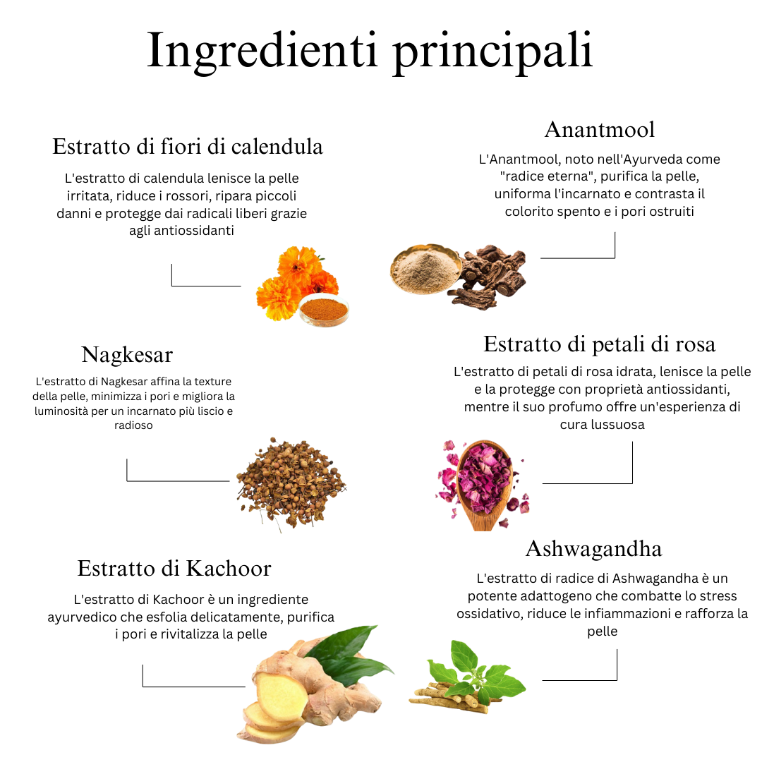 Arricchito con radice di liquirizia, Ashwagandha e zafferano, questo lussuoso detergente illumina la pelle opaca, libera i pori e migliora la luminosità naturale della pelle. Ispirata all'antica saggezza dell'Ayurveda, questa formula sfrutta il potere di ingredienti come Kasturi Manjal, Fiore Kumud e Nagkesar, noti per le loro proprietà lenitive, disintossicanti e rivitalizzanti.