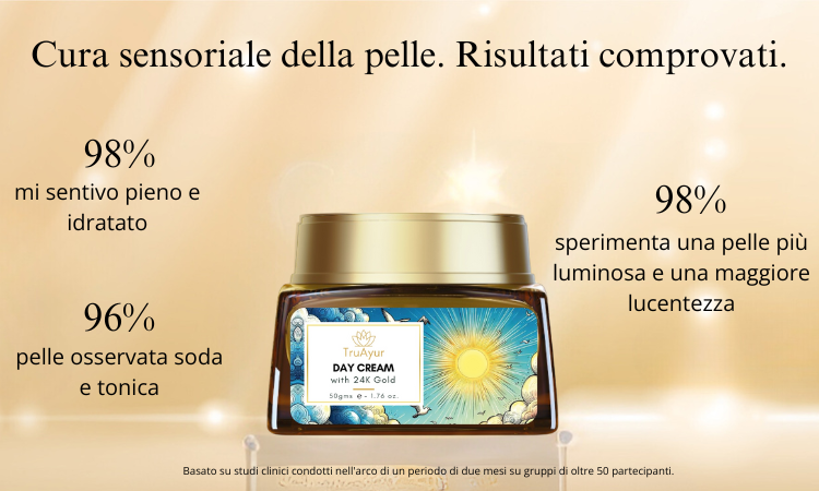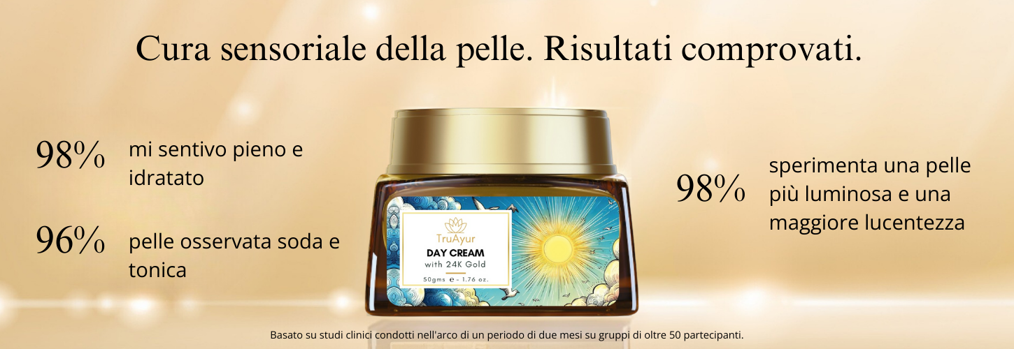 Sperimenta la perfetta armonia dell'Ayurveda e dell'innovazione con la Crema da giorno con Oro 24K: un rituale trasformativo per la cura della pelle che illumina, protegge e rivitalizza la tua pelle ogni giorno.