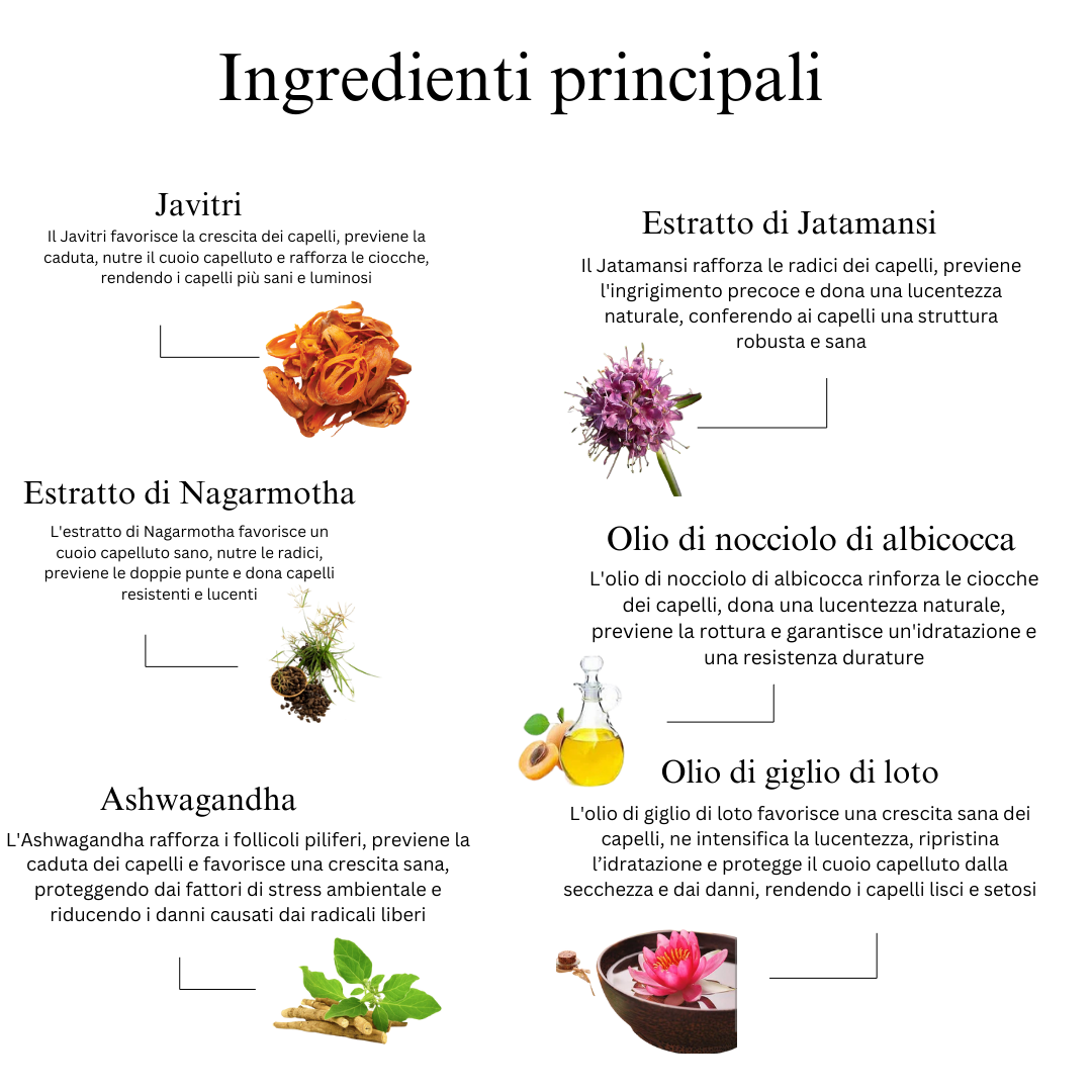 Basato sugli antichi principi dell'Ayurveda, questo siero combina ingredienti botanici testati nel tempo come l'estratto di Jatamansi, Ashwagandha e l'estratto di Nagarmotha, noti per le loro proprietà ringiovanenti. Questi ingredienti rinforzano i capelli dall'interno, riducono la rottura dei capelli e ne favoriscono la crescita. Integrato con olio di mandorle dolci, olio di nocciolo di albicocca e olio di sesamo, idrata intensamente, sigilla l'umidità e leviga ogni ciocca di capelli, mentre l'olio di giglio di loto e l'olio di arancia amara leniscono il cuoio capelluto e forniscono equilibrio e vitalità.