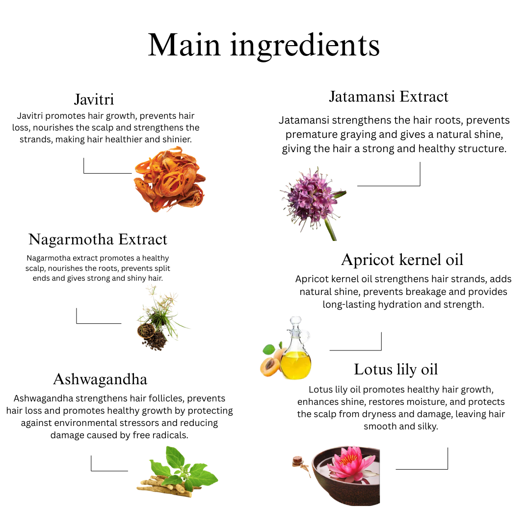 Based on the ancient principles of Ayurveda, this serum combines time-tested botanicals such as jatamansi extract, ashwagandha, and nagarmotha extract, known for their rejuvenating properties. These ingredients strengthen hair from within, reduce breakage, and promote growth. Complemented by sweet almond oil, apricot kernel oil, and sesame oil, it provides intense moisture, seals in moisture, and smooths every strand of hair, while lotus lily oil and bitter orange oil soothe the scalp and provide balance and vitality.