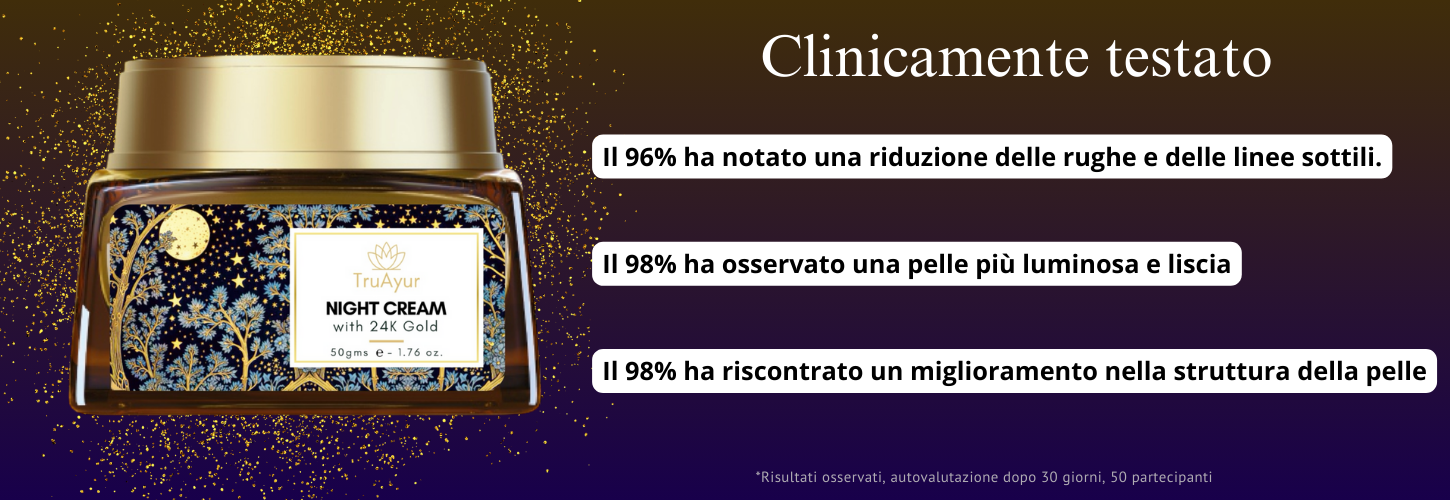 L'Ayurveda, un sistema olistico provato e testato da oltre 5.000 anni, vede la vera bellezza come un riflesso dell'equilibrio interiore. La crema notte antietà ayurvedica in oro 24 carati incarna questa convinzione combinando estratti vegetali detergenti e l'antica saggezza della natura con la moderna tecnologia per la cura della pelle per garantire una carnagione radiosa, carnosa e rivitalizzata che irradia armonia interiore e salute.
