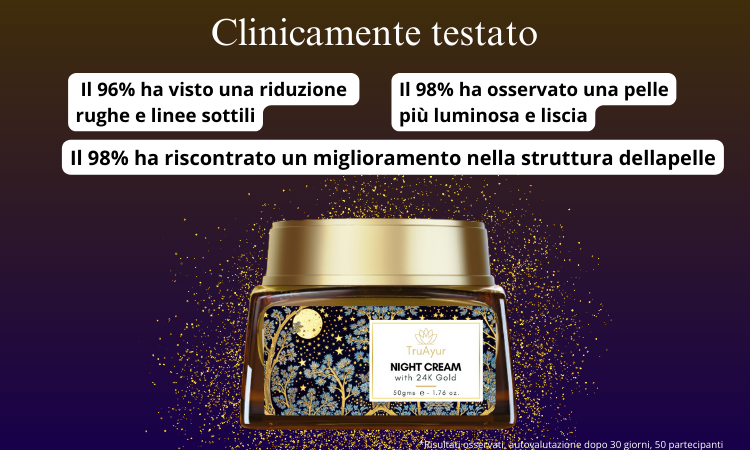 La crema notte all’oro 24 carati è una miscela sublime di antica saggezza ayurvedica e innovazione moderna nella cura della pelle, arricchita con Bhasma in oro 24 carati e una potente miscela di oltre 15 tesori botanici. Progettata per agire durante la notte, nutre, rigenera e rivitalizza intensamente la pelle, combattendo le linee sottili, le macchie scure e la carnagione irregolare, aumentando al contempo elasticità e compattezza.